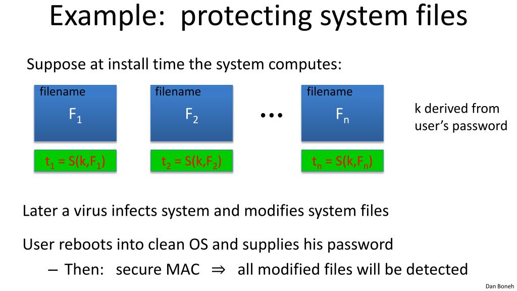 Example: protecting system files Suppose at install time the system computes: Later a virus infects system and modifies system files User reboots into clean OS and supplies his password • Then: secure MAC ⇒ all modified files will be detected filename filename filename F1 F2 Fn ⋯ k derived fromuser’s password t1 = S(k,F1) t2 = S(k,F2) tn = S(k,Fn)