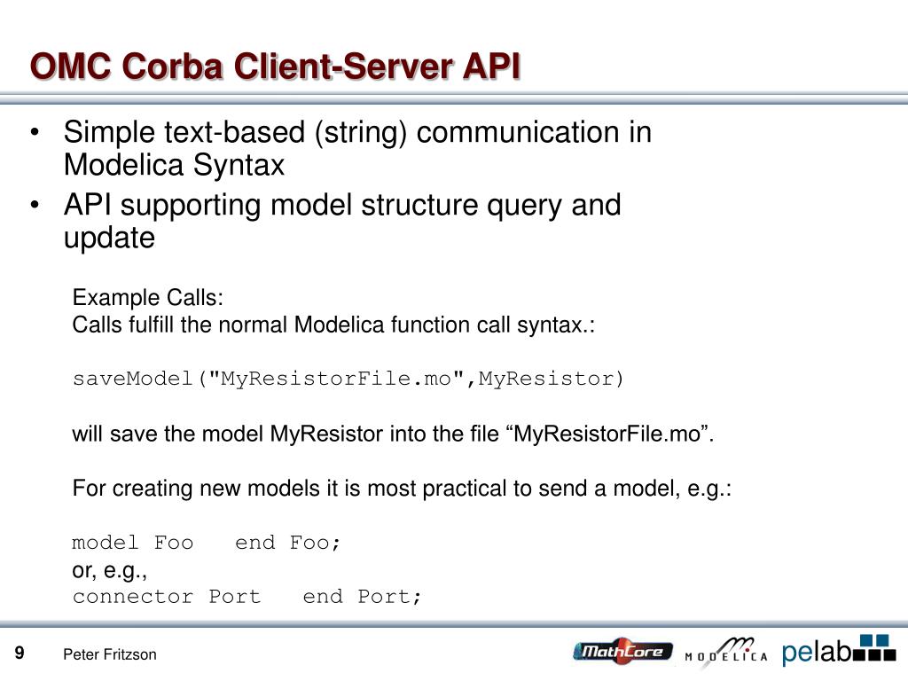 OMC Corba Client-Server API • Simple text-based (string) communication in Modelica Syntax • API supporting model structure query and update Example Calls: Calls fulfill the normal Modelica function call syntax.: saveModel("MyResistorFile.mo",MyResistor) will save the model MyResistor into the file “MyResistorFile.mo”. For creating new models it is most practical to send a model, e.g.: model Foo end Foo; or, e.g., connector Port end Port;