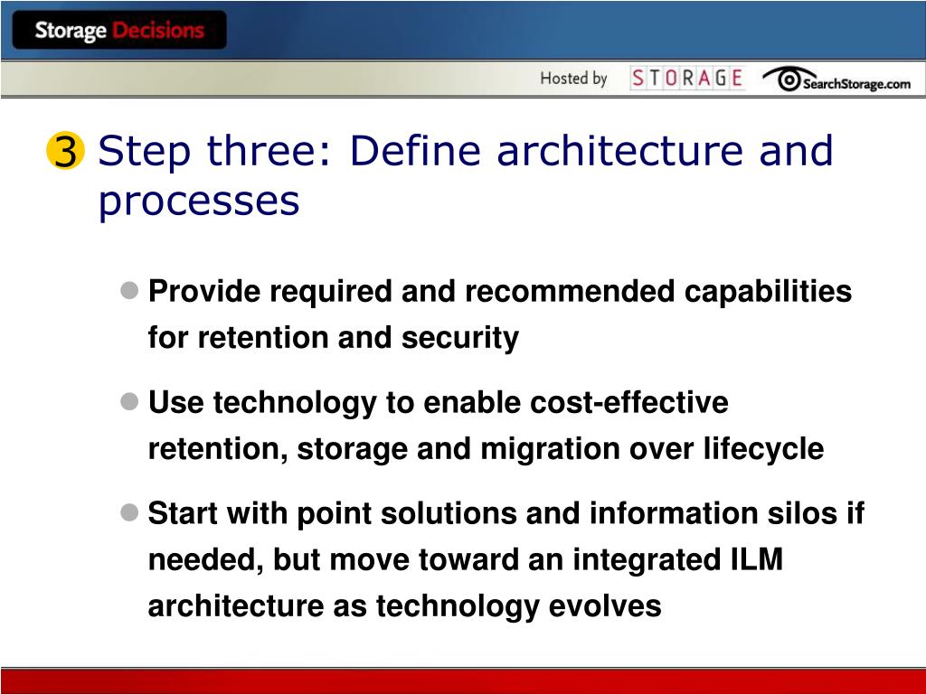 Step three: Define architecture and processes 3 • Provide required and recommended capabilities for retention and security • Use technology to enable cost-effective retention, storage and migration over lifecycle • Start with point solutions and information silos if needed, but move toward an integrated ILM architecture as technology evolves