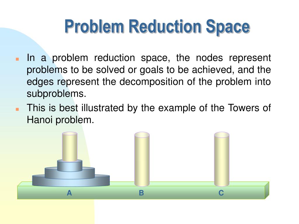 A B C A B C Problem Reduction Space • In a problem reduction space, the nodes represent problems to be solved or goals to be achieved, and the edges represent the decomposition of the problem into subproblems. • This is best illustrated by the example of the Towers of Hanoi problem.