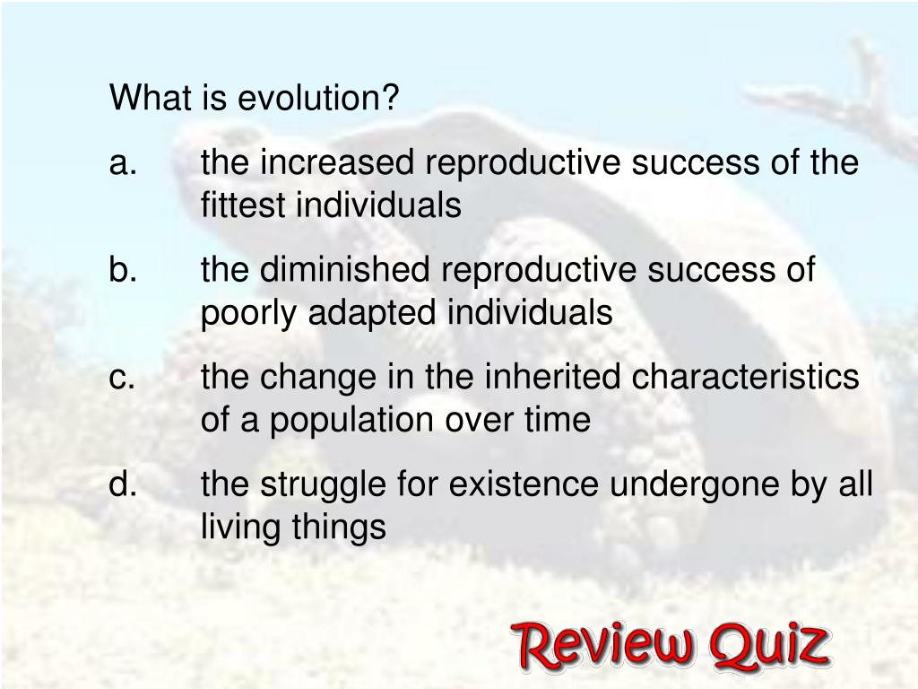 What is evolution? a. the increased reproductive success of the fittest individuals b. the diminished reproductive success of poorly adapted individuals c. the change in the inherited characteristics of a population over time d. the struggle for existence undergone by all living things