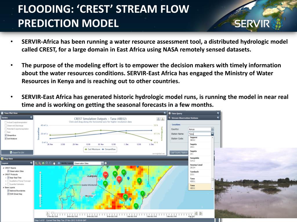 FLOODING: ‘CREST’ STREAM FLOW PREDICTION MODEL • SERVIR-Africa has been running a water resource assessment tool, a distributed hydrologic model called CREST, for a large domain in East Africa using NASA remotely sensed datasets. • The purpose of the modeling effort is to empower the decision makers with timely information about the water resources conditions. SERVIR-East Africa has engaged the Ministry of Water Resources in Kenya and is reaching out to other countries. • SERVIR-East Africa has generated historic hydrologic model runs, is running the model in near real time and is working on getting the seasonal forecasts in a few months.