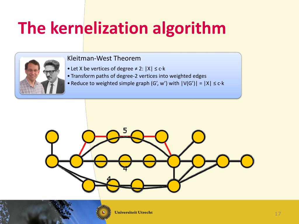 The kernelization algorithm • Kleitman-West Theorem • Let X be vertices of degree ≠ 2: |X| ≤ c·k • Transform paths of degree-2 vertices intoweighted edges • Reduce to weighted simple graph (G’, w’) with |V(G’)| = |X| ≤ c·k