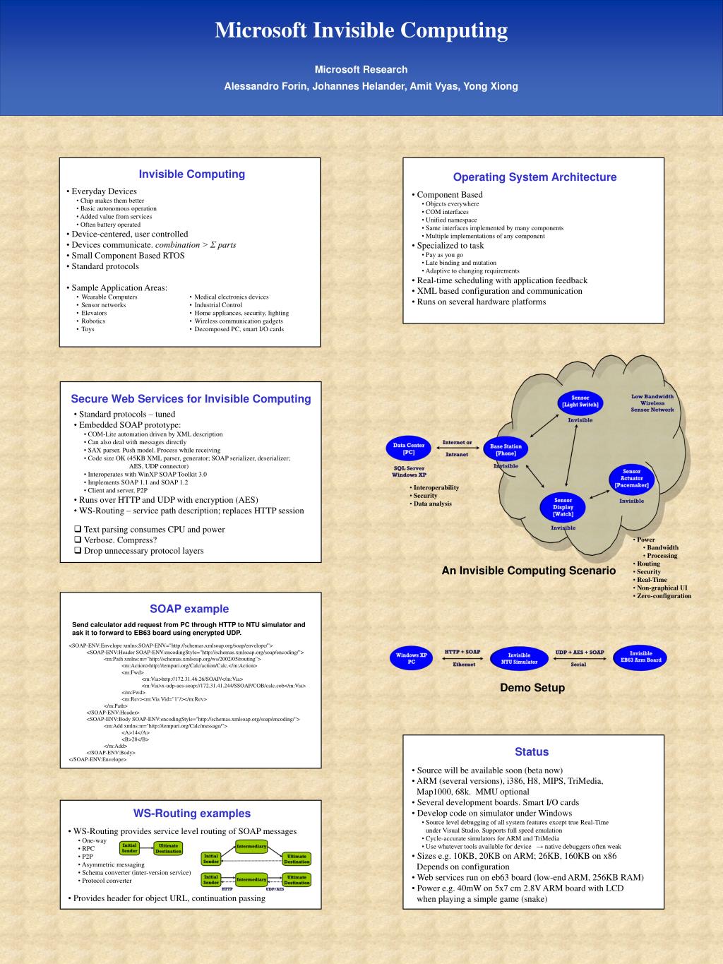 Operating System Architecture Invisible Computing • Component Based • Objects everywhere • COM interfaces • Unified namespace • Same interfaces implemented by many components • Multiple implementations of any component • Specialized to task • Pay as you go • Late binding and mutation • Adaptive to changing requirements • Real-time scheduling with application feedback • XML based configuration and communication • Runs on several hardware platforms • Everyday Devices • Chip makes them better • Basic autonomous operation • Added value from services • Often battery operated • Device-centered, user controlled • Devices communicate. combination > Σ parts • Small Component Based RTOS • Standard protocols • Sample Application Areas: • Wearable Computers • Medical electronics devices • Sensor networks • Industrial Control • Elevators • Home appliances, security, lighting • Robotics • Wireless communication gadgets • Toys • Decomposed PC, smart I/O cards • Standard protocols – tuned • Embedded SOAP prototype: • COM-Lite automation driven by XML description • Can also deal with messages directly • SAX parser. Push model. Process while receiving • Code size OK (45KB XML parser, generator; SOAP serializer, deserializer; • AES, UDP connector) • Interoperates with WinXP SOAP Toolkit 3.0 • Implements SOAP 1.1 and SOAP 1.2 • Client and server, P2P • Runs over HTTP and UDP with encryption (AES) • WS-Routing – service path description; replaces HTTP session • Text parsing consumes CPU and power • Verbose. Compress? • Drop unnecessary protocol layers • Interoperability • Security • Data analysis • Power • Bandwidth • Processing • Routing • Security • Real-Time • Non-graphical UI • Zero-configuration An Invisible Computing Scenario SOAP example Send calculator add request from PC through HTTP to NTU simulator and ask it to forward to EB63 board using encrypted UDP. <SOAP-ENV:Envelope xmlns:SOAP-ENV="http://schemas.xmlsoap.org/soap/envelope/"> <SOAP-ENV:Header SOAP-ENV:encodingStyle="http://schemas.xmlsoap.org/soap/encoding/"> <m:Path xmlns:m="http://schemas.xmlsoap.org/ws/2002/05/routing"> <m:Action>http://tempuri.org/Calc/action/Calc.</m:Action> <m:Fwd> <m:Via>http://172.31.46.26/SOAP/</m:Via> <m:Via>x-udp-aes-soap://172.31.41.244/SSOAP/COB/calc.cob</m:Via> </m:Fwd> <m:Rev><m:Via Vid="1"/></m:Rev> </m:Path> </SOAP-ENV:Header> <SOAP-ENV:Body SOAP-ENV:encodingStyle="http://schemas.xmlsoap.org/soap/encoding/"> <m:Add xmlns:m="http://tempuri.org/Calc/message/"> <A>14</A> <B>28</B> </m:Add> </SOAP-ENV:Body> </SOAP-ENV:Envelope> Demo Setup Status • Source will be available soon (beta now) • ARM (several versions), i386, H8, MIPS, TriMedia, Map1000, 68k. MMU optional • Several development boards. Smart I/O cards • Develop code on simulator under Windows • Source level debugging of all system features except true Real-Time • under Visual Studio. Supports full speed emulation • Cycle-accurate simulators for ARM and TriMedia • Use whatever tools available for device → native debuggers often weak • Sizes e.g. 10KB, 20KB on ARM; 26KB, 160KB on x86 Depends on configuration • Web services run on eb63 board (low-end ARM, 256KB RAM) • Power e.g. 40mW on 5x7 cm 2.8V ARM board with LCD • when playing a simple game (snake) WS-Routing examples • WS-Routing provides service level routing of SOAP messages • One-way • RPC • P2P • Asymmetric messaging • Schema converter (inter-version service) • Protocol converter • Provides header for object URL, continuation passing Microsoft Research Alessandro Forin, Johannes Helander, Amit Vyas, Yong Xiong Microsoft Invisible Computing Secure Web Services for Invisible Computing
