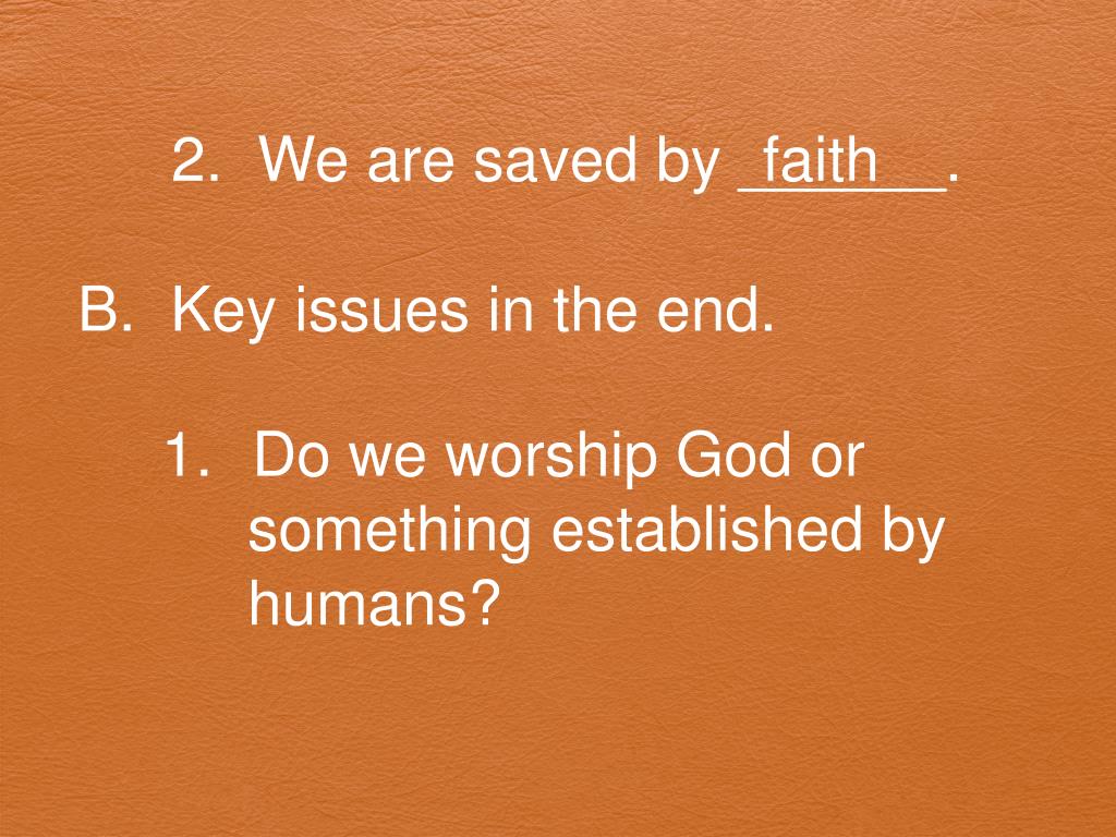 2. We are saved by ______. faith B. Key issues in the end. Do we worship God or something established by humans?
