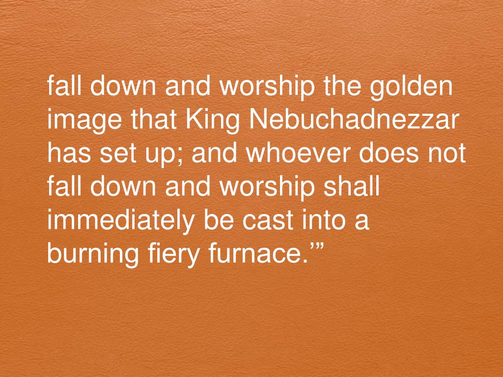 fall down and worship the golden image that King Nebuchadnezzar has set up; and whoever does not fall down and worship shall immediately be cast into a burning fiery furnace.’”