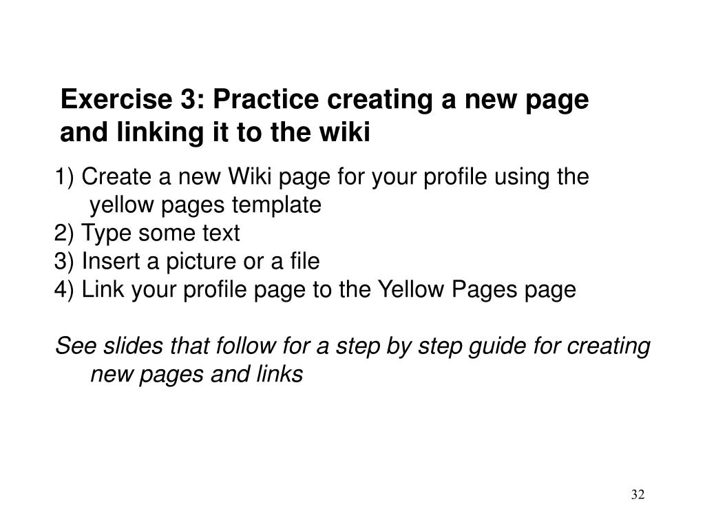 Exercise 3: Practice creating a new page and linking it to the wiki 1) Create a new Wiki page for your profile using the yellow pages template 2) Type some text 3) Insert a picture or a file 4) Link your profile page to the Yellow Pages page See slides that follow for a step by step guide for creating new pages and links