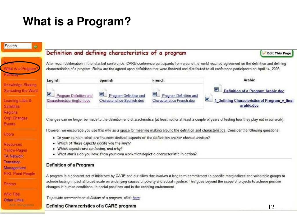 What is a “Wiki”? • A wiki is an online space, consisting of a collection of Web pages designed to enable anyone who accesses it to contribute or modify content. • Wikis are often used to create collaborativewebsites and to empower communities, such as ours around the program shift, to share and build knowledge together. • A well-known example of a very successful wiki is the collaborative encyclopedia “Wikipedia” (www.wikipedia.com). The goal of our P-shift Wiki is to serve as a global platform for all of you who are leading the program shift in CARE to share knowledge around the program shift The success of our wiki will depend on the contributions you make, and your commitment to visiting it to connect to and learn from others