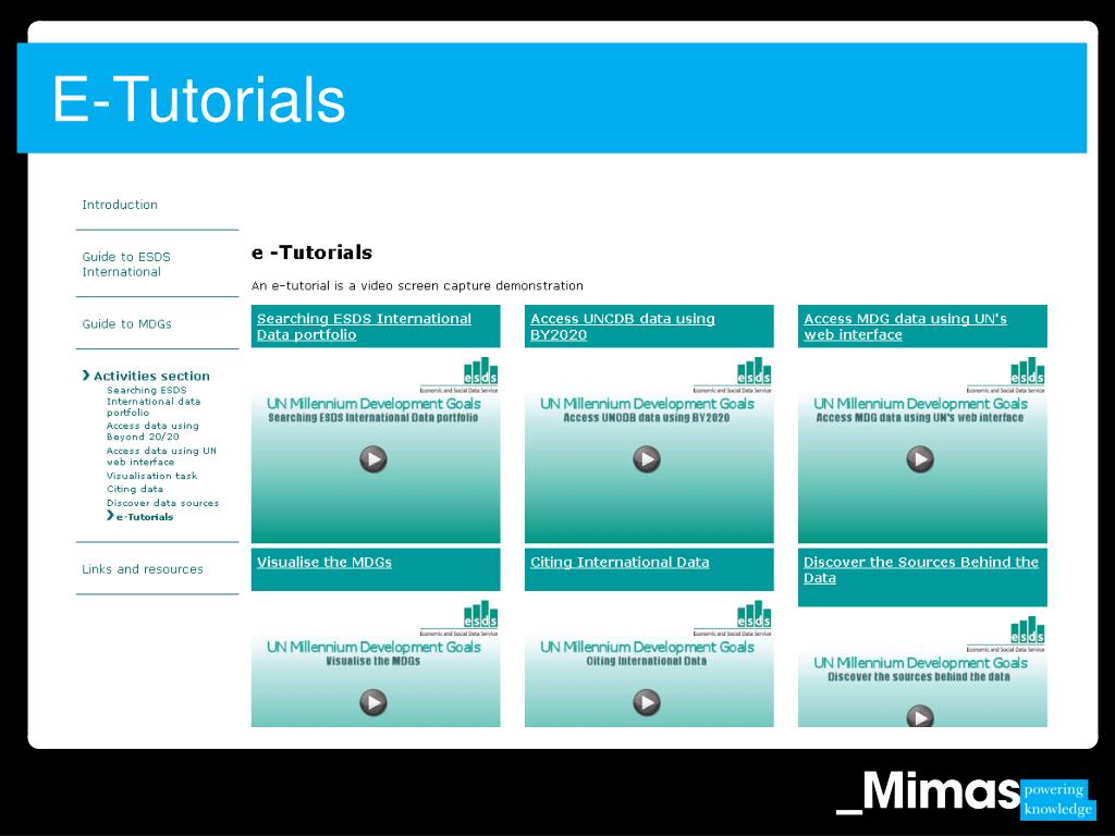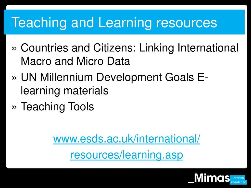 Teaching and Learning resources • Countries and Citizens: Linking International Macro and Micro Data • UN Millennium Development Goals E-learning materials • Teaching Tools www.esds.ac.uk/international/ resources/learning.asp