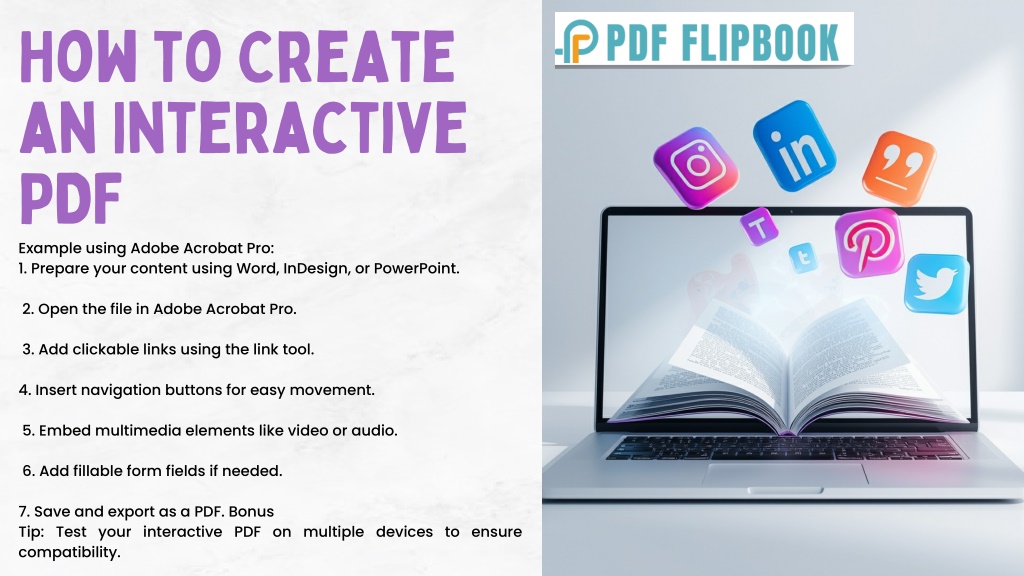 How to Create an Interactive PDF Example using Adobe Acrobat Pro: 1. Prepare your content using Word, InDesign, or PowerPoint. 2. Open the file in Adobe Acrobat Pro. 3. Add clickable links using the link tool. 4. Insert navigation buttons for easy movement. 5. Embed multimedia elements like video or audio. 6. Add fillable form fields if needed. 7. Save and export as a PDF. Bonus Tip: Test your interactive PDF on multiple devices to ensure compatibility.