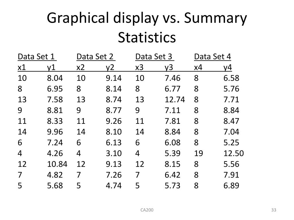 Graphical display vs. Summary Statistics Data Set 1 Data Set 2 Data Set 3 Data Set 4 x1 y1 x2 y2 x3 y3 x4 y4 10 8.04 10 9.14 10 7.46 8 6.58 8 6.95 8 8.14 8 6.77 8 5.76 13 7.58 13 8.74 13 12.74 8 7.71 9 8.81 9 8.77 9 7.11 8 8.84 11 8.33 11 9.26 11 7.81 8 8.47 14 9.96 14 8.10 14 8.84 8 7.04 6 7.24 6 6.13 6 6.08 8 5.25 4 4.26 4 3.10 4 5.39 19 12.50 12 10.84 12 9.13 12 8.15 8 5.56 7 4.82 7 7.26 7 6.42 8 7.91 5 5.68 5 4.74 5 5.73 8 6.89 CA200