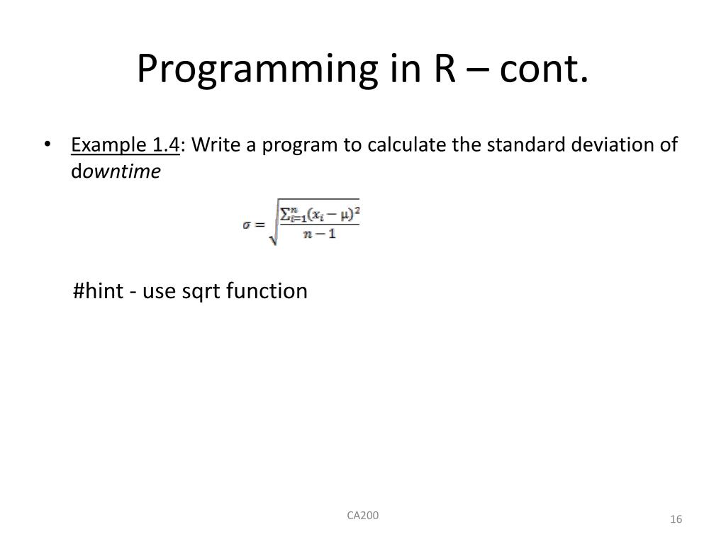 Programming in R – cont. • Example 1.4: Write a program to calculate the standard deviation of downtime #hint - use sqrt function CA200
