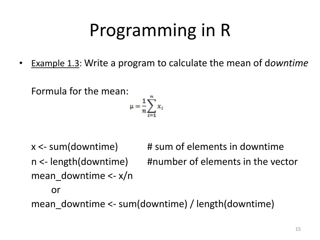 Programming in R • Example 1.3: Write a program to calculate the mean of downtime Formula for the mean: x <- sum(downtime) # sum of elements in downtime n <- length(downtime) #number of elements in the vector mean_downtime <- x/n or mean_downtime <- sum(downtime) / length(downtime)
