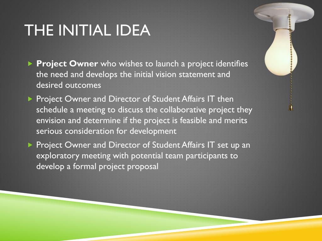 The Initial Idea • Project Owner who wishes to launch a project identifies the need and develops the initial vision statement and desired outcomes • Project Owner and Director of Student Affairs IT then schedule a meeting to discuss the collaborative project they envision and determine if the project is feasible and merits serious consideration for development • Project Owner and Director of Student Affairs IT set up an exploratory meeting with potential team participants to develop a formal project proposal