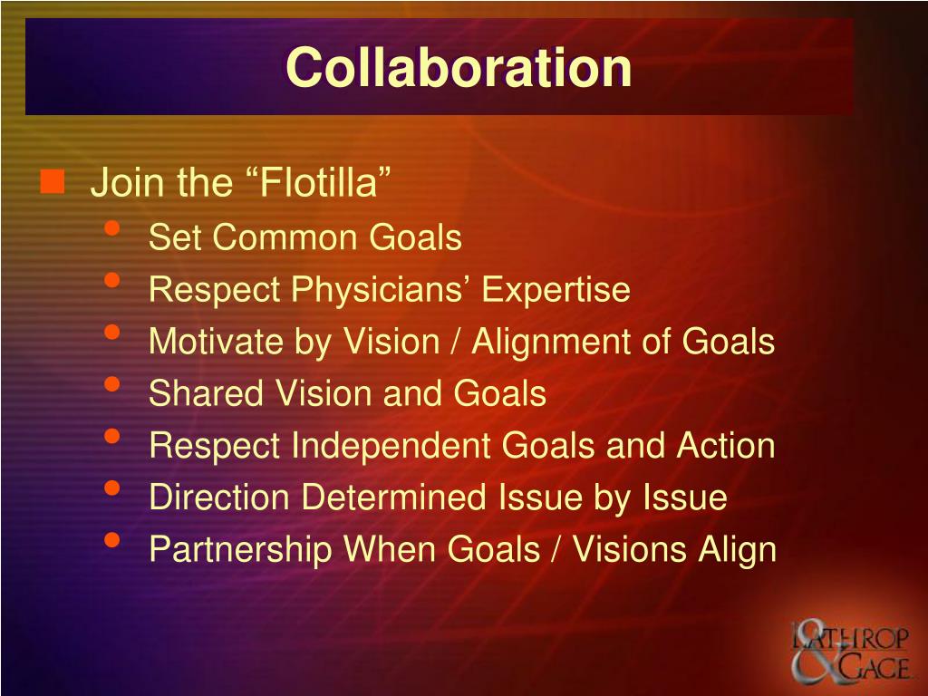 Collaboration • Join the “Flotilla” • Set Common Goals • Respect Physicians’ Expertise • Motivate by Vision / Alignment of Goals • Shared Vision and Goals • Respect Independent Goals and Action • Direction Determined Issue by Issue • Partnership When Goals / Visions Align