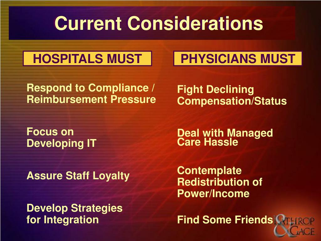 Current Considerations HOSPITALS MUST PHYSICIANS MUST Respond to Compliance / Reimbursement Pressure Fight Declining Compensation/Status Focus on Developing IT Deal with Managed Care Hassle Assure Staff Loyalty Contemplate Redistribution of Power/Income Develop Strategies for Integration Find Some Friends