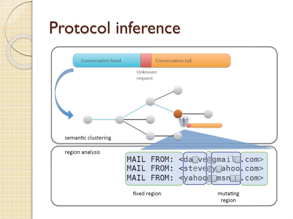 Endpoint Analysis • cleaning and normalizing the collected traffic to remove spurious traces and improve the effectiveness of the protocol learning phase • the cleaning phase mainly consists in grouping together traces that exhibit a comparable network behavior