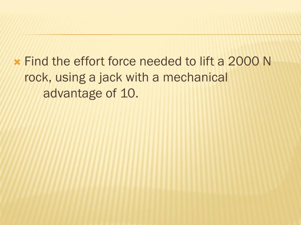 Fr = 2000 N MA = 10 Fe = ? MA = Fr / Fe Fe = Fr/ MA Fe = (2000 N)/(10) Fe = 200 N