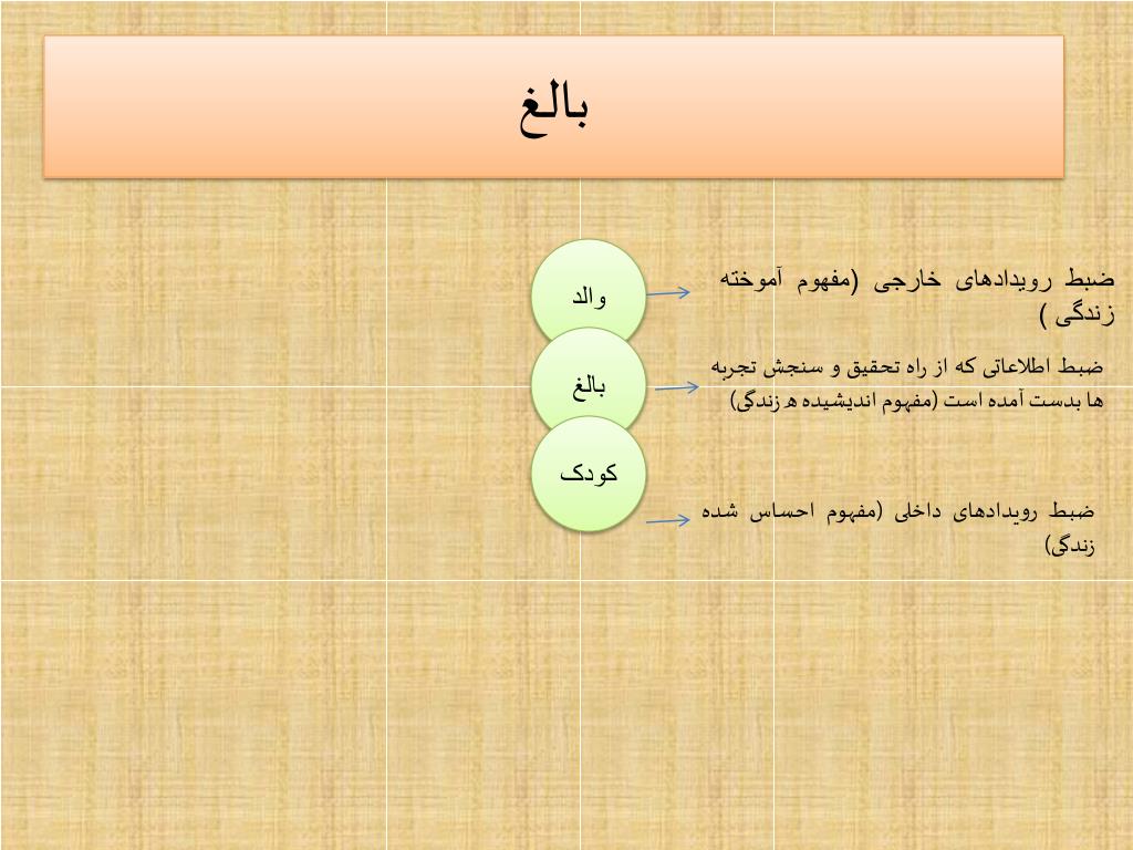 بالغ والد ضبط رویدادهای خارجی (مفهوم آموخته زندگی ) بالغ ضبط اطلاعاتی که از راه تحقیق و سنجش تجربه ها بدست آمده است (مفهوم اندیشیده ه زندگی) کودک ضبط رویدادهای داخلی (مفهوم احساس شده زندگی)