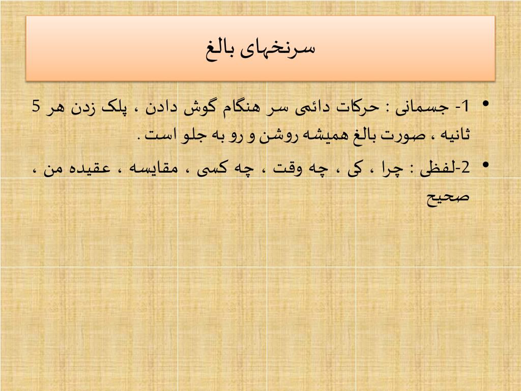 سرنخهای بالغ • 1- جسمانی : حرکات دائمی سر هنگام گوش دادن ، پلک زدن هر 5 ثانیه ، صورت بالغ همیشه روشن و رو به جلو است . • 2-لفظی : چرا ، کی ، چه وقت ، چه کسی ، مقایسه ، عقیده من ، صحیح