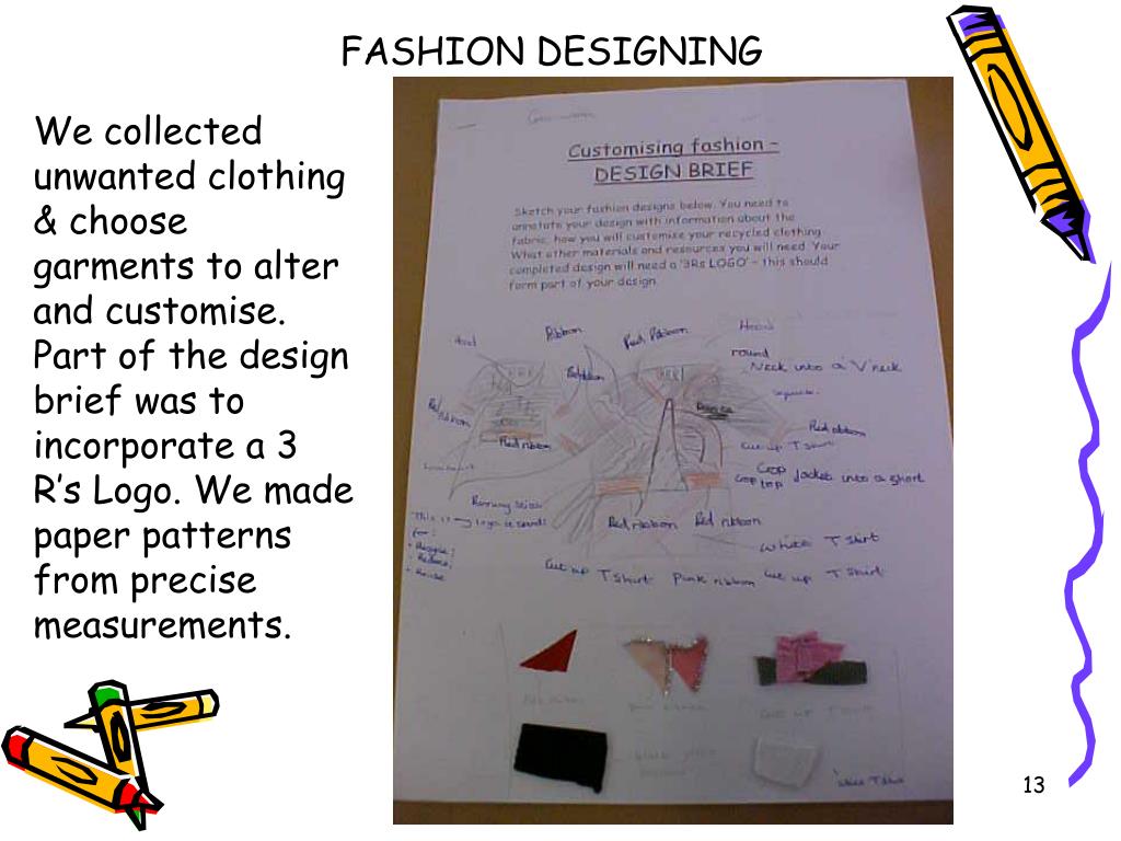 FASHION DESIGNING We collected unwanted clothing & choose garments to alter and customise. Part of the design brief was to incorporate a 3 R’s Logo. We made paper patterns from precise measurements.