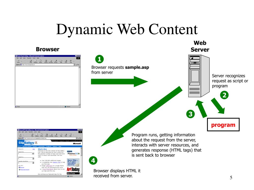 Dynamic Web Content Web Server Browser 1 Browser requests sample.asp from server Server recognizes request as script or program 2 3 program Program runs, getting information about the request from the server, interacts with server resources, and generates response (HTML tags) that is sent back to browser 4 Browser displays HTML it received from server.