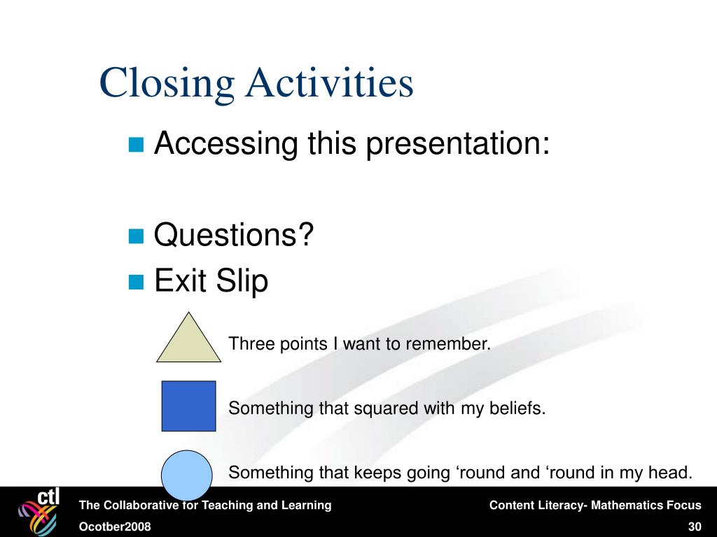 Closing Activities • Accessing this presentation: • Questions? • Exit Slip Three points I want to remember. Something that squared with my beliefs. Something that keeps going ‘round and ‘round in my head.