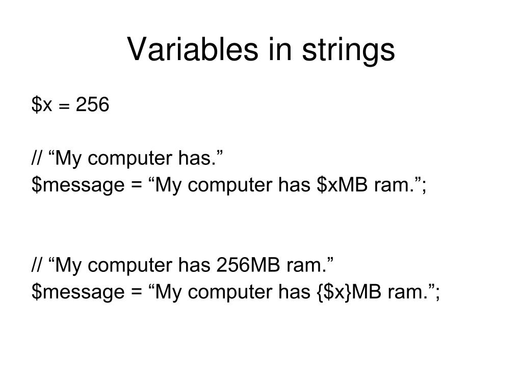 Variables in strings $x = 256 // “My computer has.” $message = “My computer has $xMB ram.”; // “My computer has 256MB ram.” $message = “My computer has {$x}MB ram.”;