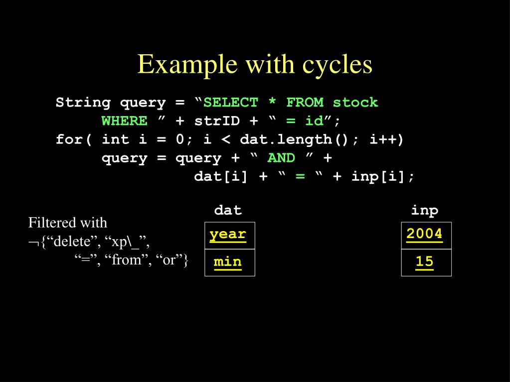 Example with cycles String query = “SELECT * FROM stock WHERE ” + strID + “ = id”; for( int i = 0; i < dat.length(); i++) query = query + “ AND ” + dat[i] + “ = “ + inp[i]; dat inp Filtered with {“delete”, “xp\_”, “=”, “from”, “or”} min min 14 15) SELECT * FROM stock WHERE NOT(1= id ANDmin=14ANDmin=15)