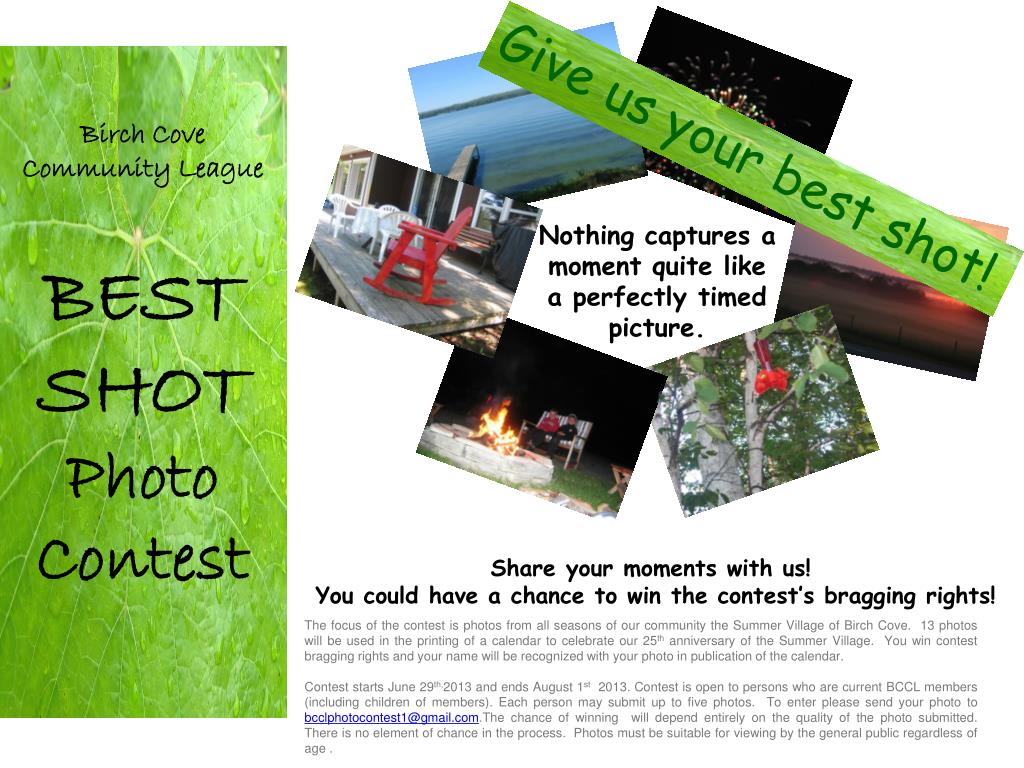 Birch Cove Community League BEST SHOT Photo Contest Give us your best shot! Nothing captures a moment quite like a perfectly timed picture. Share your moments with us! You could have a chance to win the contest’s bragging rights! The focus of the contest is photos from all seasons of our community the Summer Village of Birch Cove. 13 photos will be used in the printing of a calendar to celebrate our 25th anniversary of the Summer Village. You win contest bragging rights and your name will be recognized with your photo in publication of the calendar. Contest starts June 29th,2013 and ends August 1st2013. Contest is open to persons who are current BCCL members (including children of members). Each person may submit up to five photos.To enter please send your photo to bcclphotocontest1@gmail.com.The chance of winning will depend entirely on the quality of the photo submitted. There is no element of chance in the process. Photos must be suitable for viewing by the general public regardless of age .