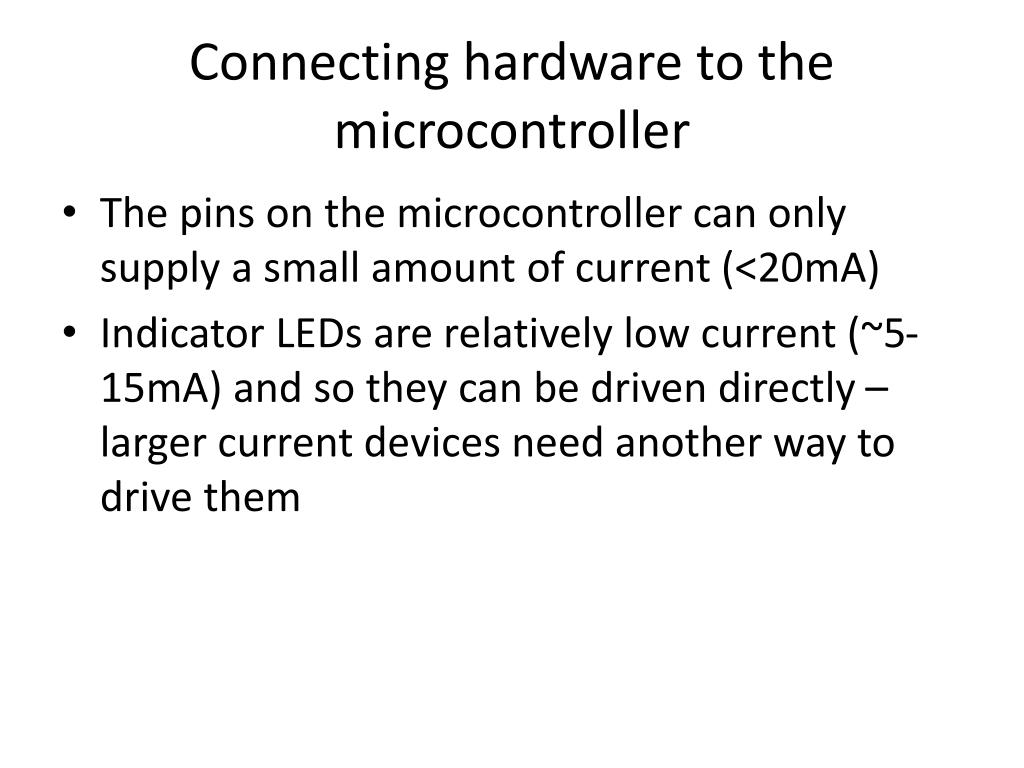 Connecting hardware to the microcontroller • The pins on the microcontroller can only supply a small amount of current (<20mA) • Indicator LEDs are relatively low current (~5-15mA) and so they can be driven directly – larger current devices need another way to drive them