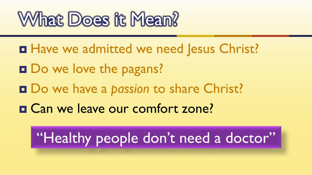 What Does it Mean? • Have we admitted we need Jesus Christ? • Do we love the pagans? • Do we have a passion to share Christ? • Can we leave our comfort zone? “Healthy people don’t need a doctor”