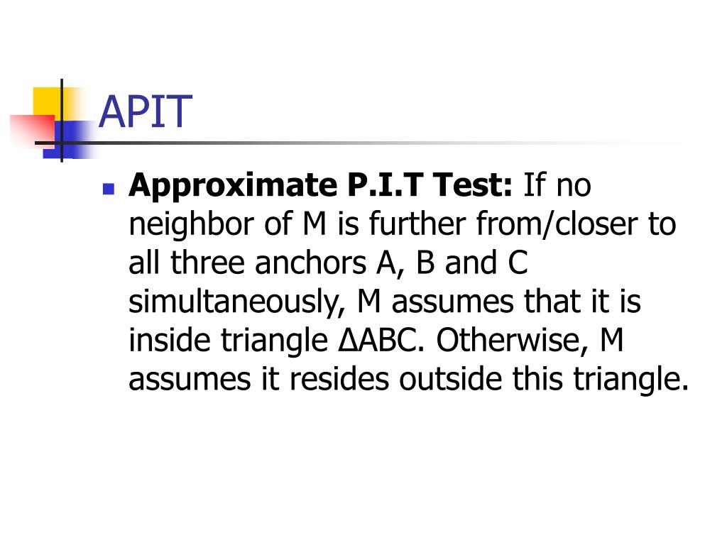 APIT • Approximate P.I.T Test: If no neighbor of M is further from/closer to all three anchors A, B and C simultaneously, M assumes that it is inside triangle ΔABC. Otherwise, M assumes it resides outside this triangle.