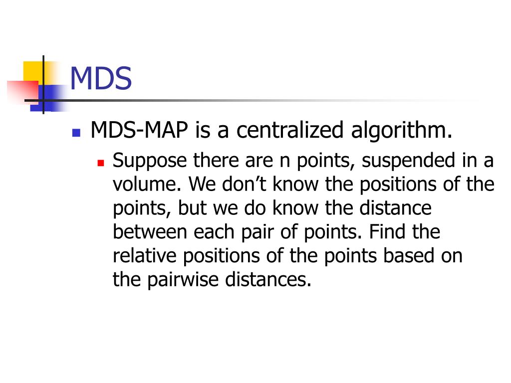 MDS • MDS-MAP is a centralized algorithm. • Suppose there are n points, suspended in a volume. We don’t know the positions of the points, but we do know the distance between each pair of points. Find the relative positions of the points based on the pairwise distances.