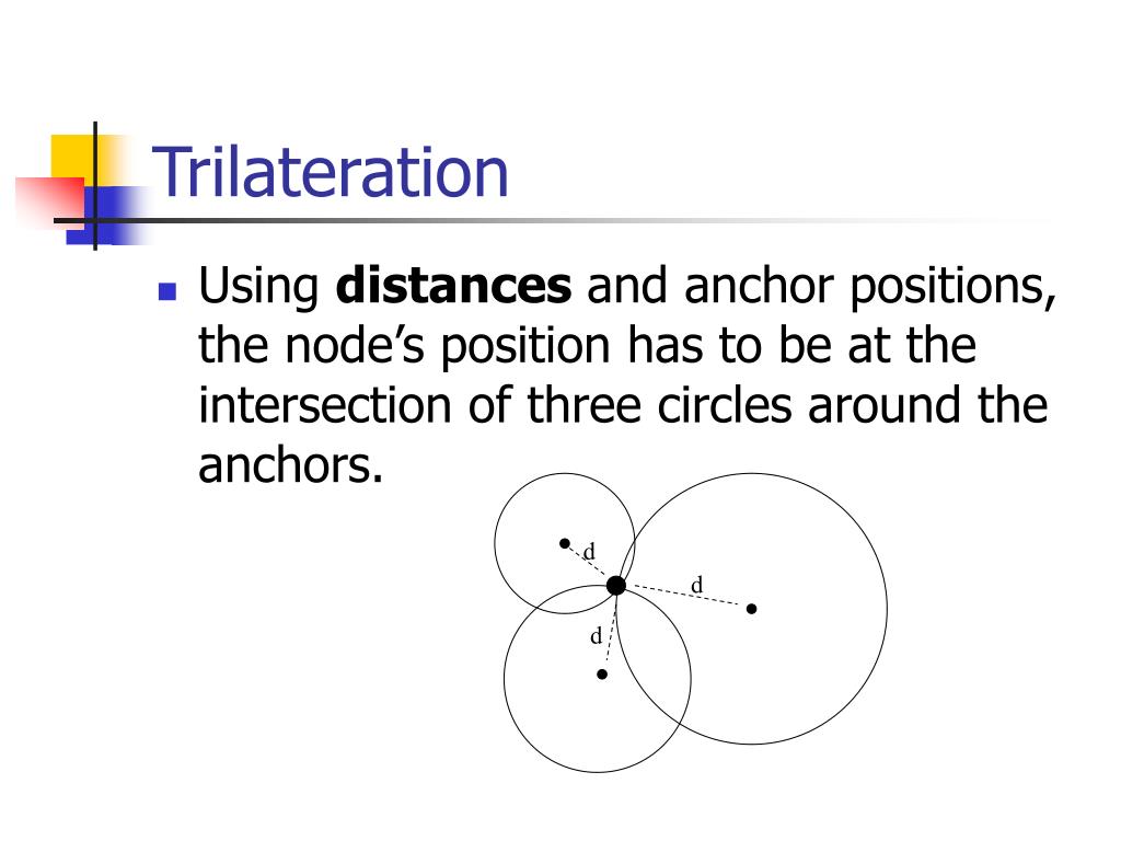 Trilateration • Using distances and anchor positions, the node’s position has to be at the intersection of three circles around the anchors. d d d