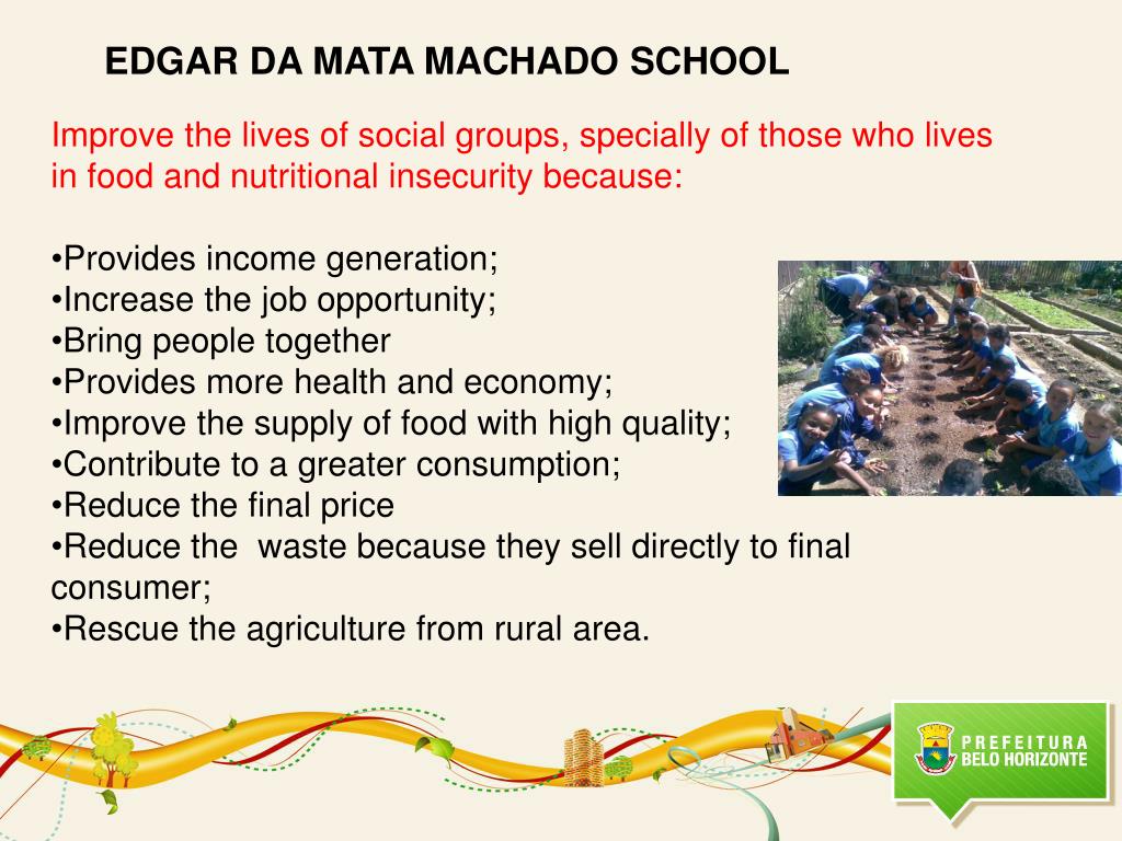 EDGAR DA MATA MACHADO SCHOOL Improvethelivesof social groups, speciallyofthosewholives in foodandnutritionalinsecuritybecause: • Providesincomegeneration; • Increasethejobopportunity; • Bringpeopletogether • Provides more healthandeconomy; • Improvethesupplyoffoodwithhighquality; • Contribute to a greaterconsumption; • Reducethe final price • Reducethewastebecausetheyselldirectly to final consumer; • Rescuetheagriculturefrom rural area.