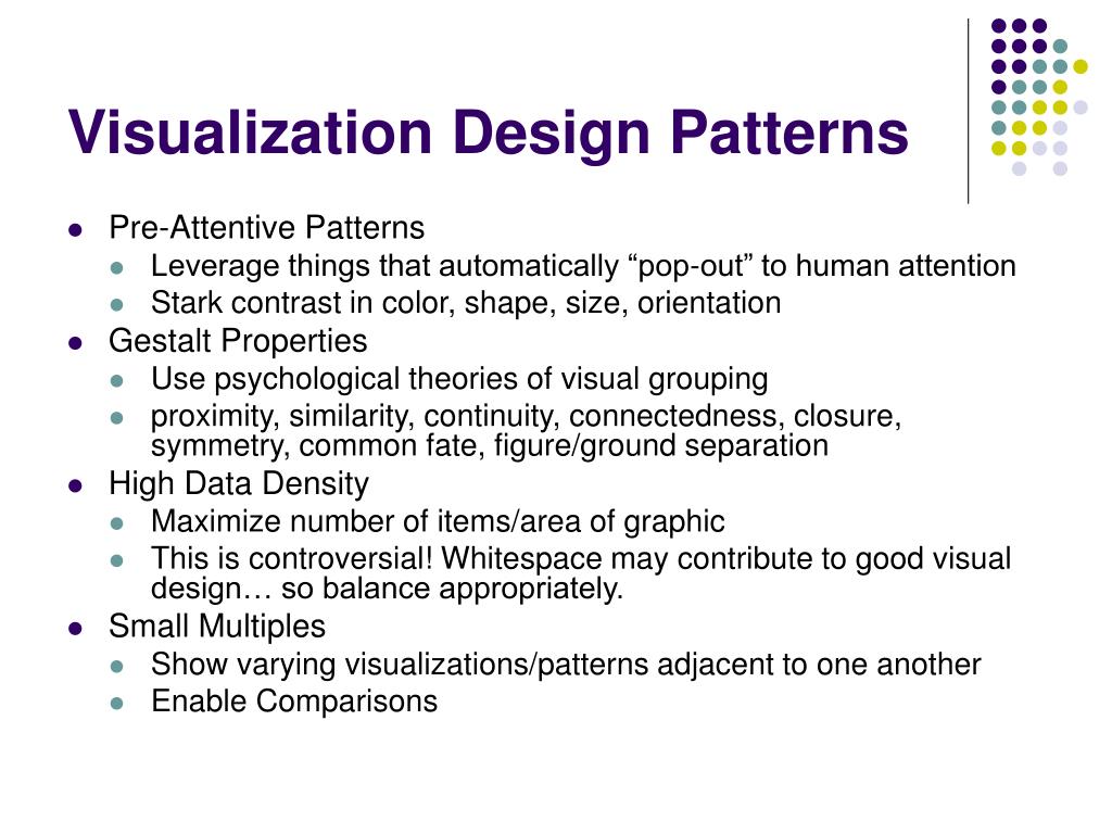 Visualization Design Patterns • Pre-Attentive Patterns • Leverage things that automatically “pop-out” to human attention • Stark contrast in color, shape, size, orientation • Gestalt Properties • Use psychological theories of visual grouping • proximity, similarity, continuity, connectedness, closure, symmetry, common fate, figure/ground separation • High Data Density • Maximize number of items/area of graphic • This is controversial! Whitespace may contribute to good visual design… so balance appropriately. • Small Multiples • Show varying visualizations/patterns adjacent to one another • Enable Comparisons