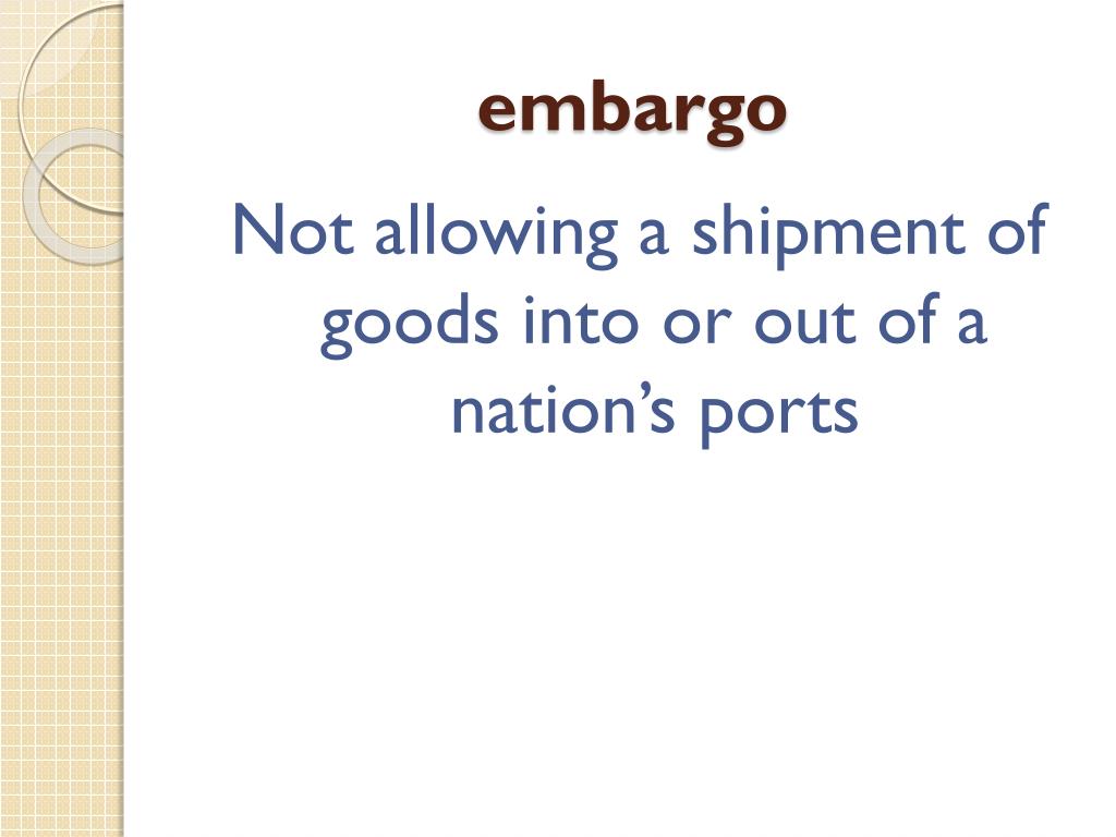 embargo Not allowing a shipment of goods into or out of a nation’s ports