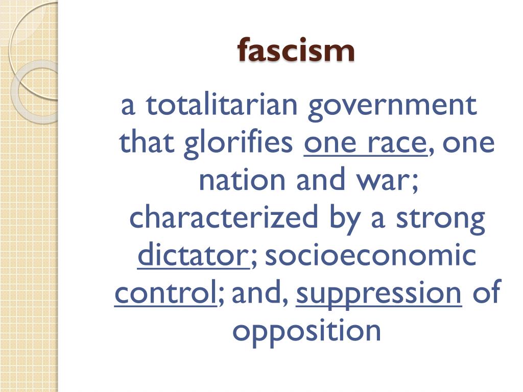 fascism a totalitarian government that glorifies one race, one nation and war; characterized by a strong dictator; socioeconomic control; and, suppressionof opposition