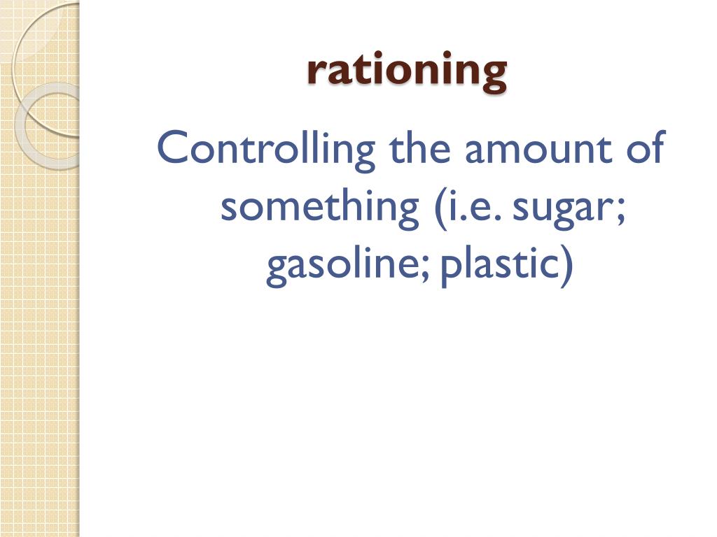 rationing Controlling the amount of something (i.e. sugar; gasoline; plastic)