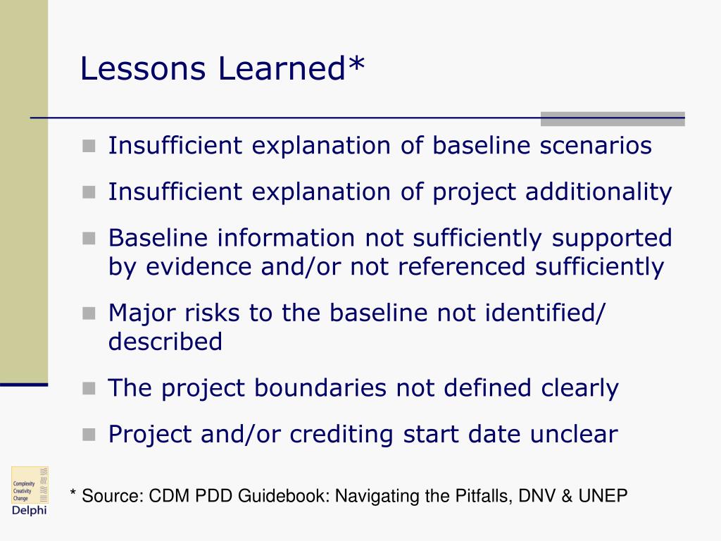 Lessons Learned* • Insufficient explanation of baseline scenarios • Insufficient explanation of project additionality • Baseline information not sufficiently supported by evidence and/or not referenced sufficiently • Major risks to the baseline not identified/ described • The project boundaries not defined clearly • Project and/or crediting start date unclear * Source: CDM PDD Guidebook: Navigating the Pitfalls, DNV & UNEP
