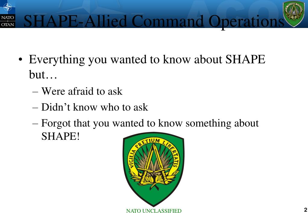 SHAPE-Allied Command Operations • Everything you wanted to know about SHAPE but… • Were afraid to ask • Didn’t know who to ask • Forgot that you wanted to know something about SHAPE! NATO UNCLASSIFIED