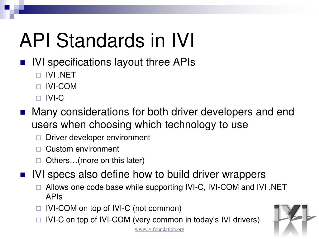 Driver Architecture Spec’s IVI-3.1: Driver Architecture Specification IVI-3.2: Inherent Capabilities Specification IVI-3.3: Standard Cross-Class Capabilities Specification IVI-3.4: API Style Guide IVI-3.5: IVI Configuration Server Specification IVI-3.6: COM Session Factory Specification IVI-3.9: C Shared Components IVI-3.12: Floating Point Services Specification IVI-3.14: Primary Interop Assembly Specification IVI-3.15: IviLxiSync Specification IVI-3.17: Installer Requirements Specification IVI-3.18: IVI.NET Utility Classes and Interfaces Specification www.ivifoundation.org