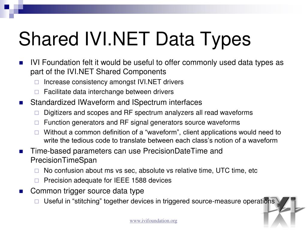 Shared IVI.NET Data Types • IVI Foundation felt it would be useful to offer commonly used data types as part of the IVI.NET Shared Components • Increase consistency amongst IVI.NET drivers • Facilitate data interchange between drivers • Standardized IWaveform and ISpectrum interfaces • Digitizers and scopes and RF spectrum analyzers all read waveforms • Function generators and RF signal generators source waveforms • Without a common definition of a “waveform”, client applications would need to write the tedious code to translate between each class’s notion of a waveform • Time-based parameters can use PrecisionDateTime and PrecisionTimeSpan • No confusion about msvs sec, absolute vs relative time, UTC time, etc • Precision adequate for IEEE 1588 devices • Common trigger source data type • Useful in “stitching” together devices in triggered source-measure operations www.ivifoundation.org