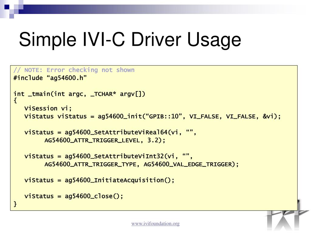 Simple IVI-C Driver Usage // NOTE: Error checking not shown #include “ag54600.h” int _tmain(int argc, _TCHAR* argv[]){ ViSession vi; ViStatus viStatus = ag54600_init(“GPIB::10”, VI_FALSE, VI_FALSE, &vi); viStatus = ag54600_SetAttributeViReal64(vi, “”, AG54600_ATTR_TRIGGER_LEVEL, 3.2); viStatus = ag54600_SetAttributeViInt32(vi, “”, AG54600_ATTR_TRIGGER_TYPE, AG54600_VAL_EDGE_TRIGGER); viStatus = ag54600_InitiateAcquisition(); viStatus = ag54600_close(); } www.ivifoundation.org