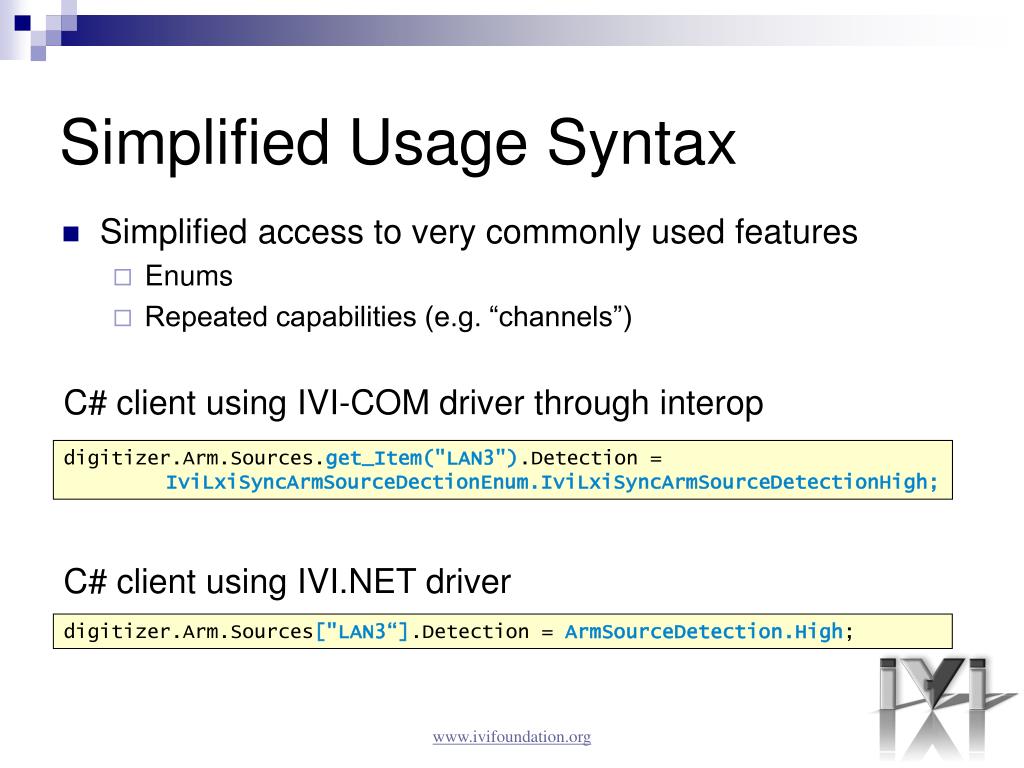 Simplified Usage Syntax • Simplified access to very commonly used features • Enums • Repeated capabilities (e.g. “channels”) C# client using IVI-COM driver through interop digitizer.Arm.Sources.get_Item("LAN3").Detection = IviLxiSyncArmSourceDectionEnum.IviLxiSyncArmSourceDetectionHigh; C# client using IVI.NET driver digitizer.Arm.Sources["LAN3“].Detection = ArmSourceDetection.High; www.ivifoundation.org