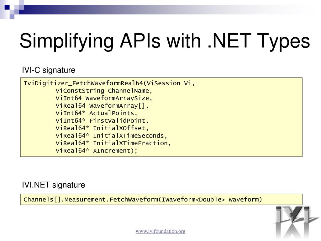 Simplifying APIs with .NET Types IVI-C signature IviDigitizer_FetchWaveformReal64(ViSession Vi, ViConstString ChannelName, ViInt64 WaveformArraySize, ViReal64 WaveformArray[], ViInt64* ActualPoints, ViInt64* FirstValidPoint, ViReal64* InitialXOffset, ViReal64* InitialXTimeSeconds, ViReal64* InitialXTimeFraction, ViReal64* XIncrement); IVI.NET signature Channels[].Measurement.FetchWaveform(IWaveform<Double> waveform) www.ivifoundation.org