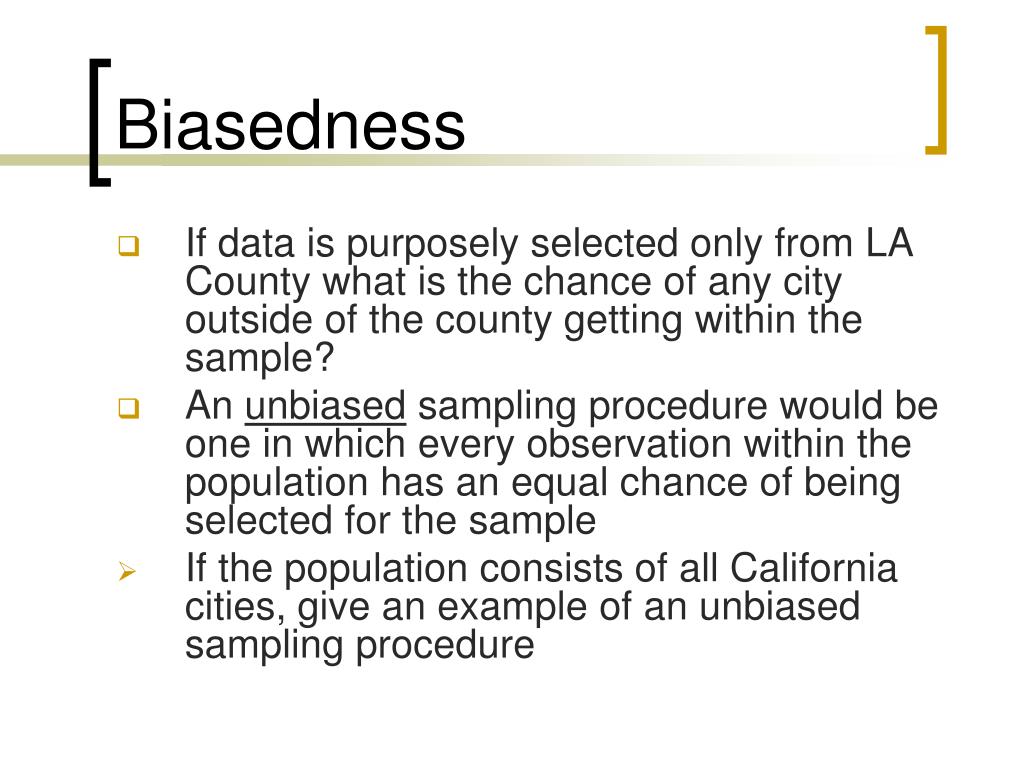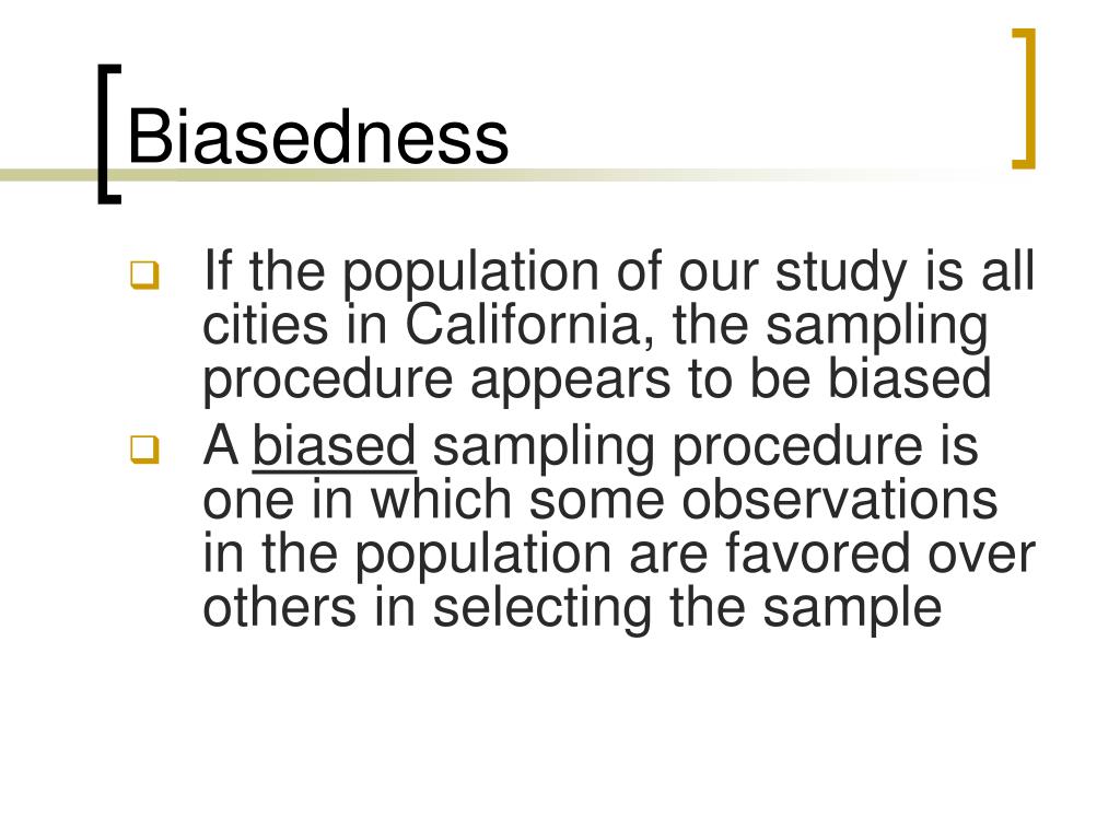 Biasedness • If the population of our study is all cities in California, the sampling procedure appears to be biased • A biased sampling procedure is one in which some observations in the population are favored over others in selecting the sample