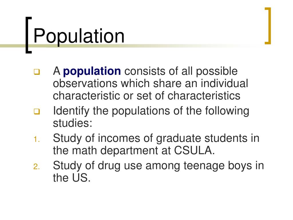 Population • A population consists of all possible observations which share an individual characteristic or set of characteristics • Identify the populations of the following studies: • Study of incomes of graduate students in the math department at CSULA. • Study of drug use among teenage boys in the US.