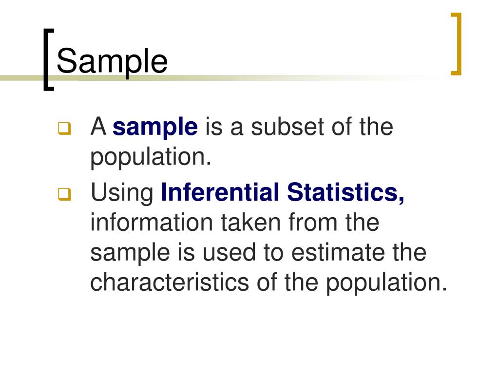 Sample • A sample is a subset of the population. • Using Inferential Statistics, information taken from the sample is used to estimate the characteristics of the population.